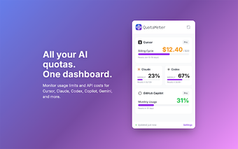 QuotaMeter는 사용자가 AI 서비스 사용량과 API 지출을 통합 대시보드에서 모니터링할 수 있도록 설계된 Chrome 확장 프로그램입니다. 사용자는 Cursor, Claude, Codex (ChatGPT), GitHub Copilot 및 Google Gemini를 포함한 다양한 AI 플랫폼에서 구독 쿼터와 비용을 추적할 수 있습니다. 대시보드는 색상 코드가 있는 진행률 막대를 통해 남은 한도를 명확하게 보여주어 사용자가 자원을 효과적으로 극대화할 수 있도록 합니다.